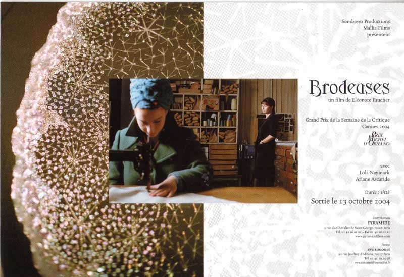 Synopsis : When Claire learns that she is five months pregnant at the tender age of 17, she decides to give birth anonymously. She finds refuge with Madame Melikian, an embroiderer for haute couture designers. And, day by day, stitch by stitch, as Claire's belly grows rounder, the threads of embroidery create a filial bond between them. 2003/88min (release dates: 13 October 2004) Directed by: Eléonore Faucher With: Lola Naymark, Ariane Ascaride Distributor (Japan) : Cinequanon