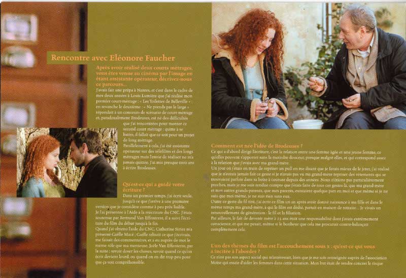 Article paru dans http://www.france5.fr/cannes/W00102/18/111451.cfm Brodeuses Avec ce film, Eléonore Faucher nous offre un cinéma parlant de la filiation, du deuil et de l'amour. A 17 ans, peut-on accepter de voir son ventre porter la vie, quand la présence même de son propre corps en mutation vous paraît étrangère ?